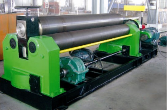 該機結構形式為三輥非對稱式,上輥為主傳動,下輥垂直升降運動,以便夾緊板材,并通過下輥齒輪與上輥齒輪嚙合,同時作為主動傳動;邊錕作傾升運動,具有預彎和卷圓雙重功能.結構緊湊,操作維修方便.