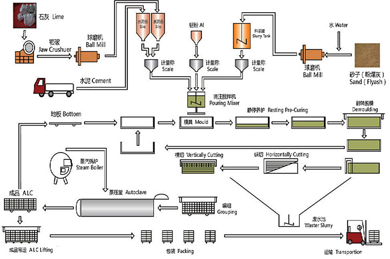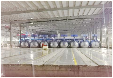 我司生產基地設有一條專業(yè)生產 ALC(蒸壓加氣混凝土板)的全自動化生產線,八條高溫蒸壓釜,在將原材料研磨-攪拌-澆注-將鋼筋網籠放到模具里-靜養(yǎng)3小時-脫模切割-升溫、恒溫、降溫共14小時的精細工藝流程后,生產出來的墻板在耐久性、抗凍性、抗?jié)B性方面表現很好。